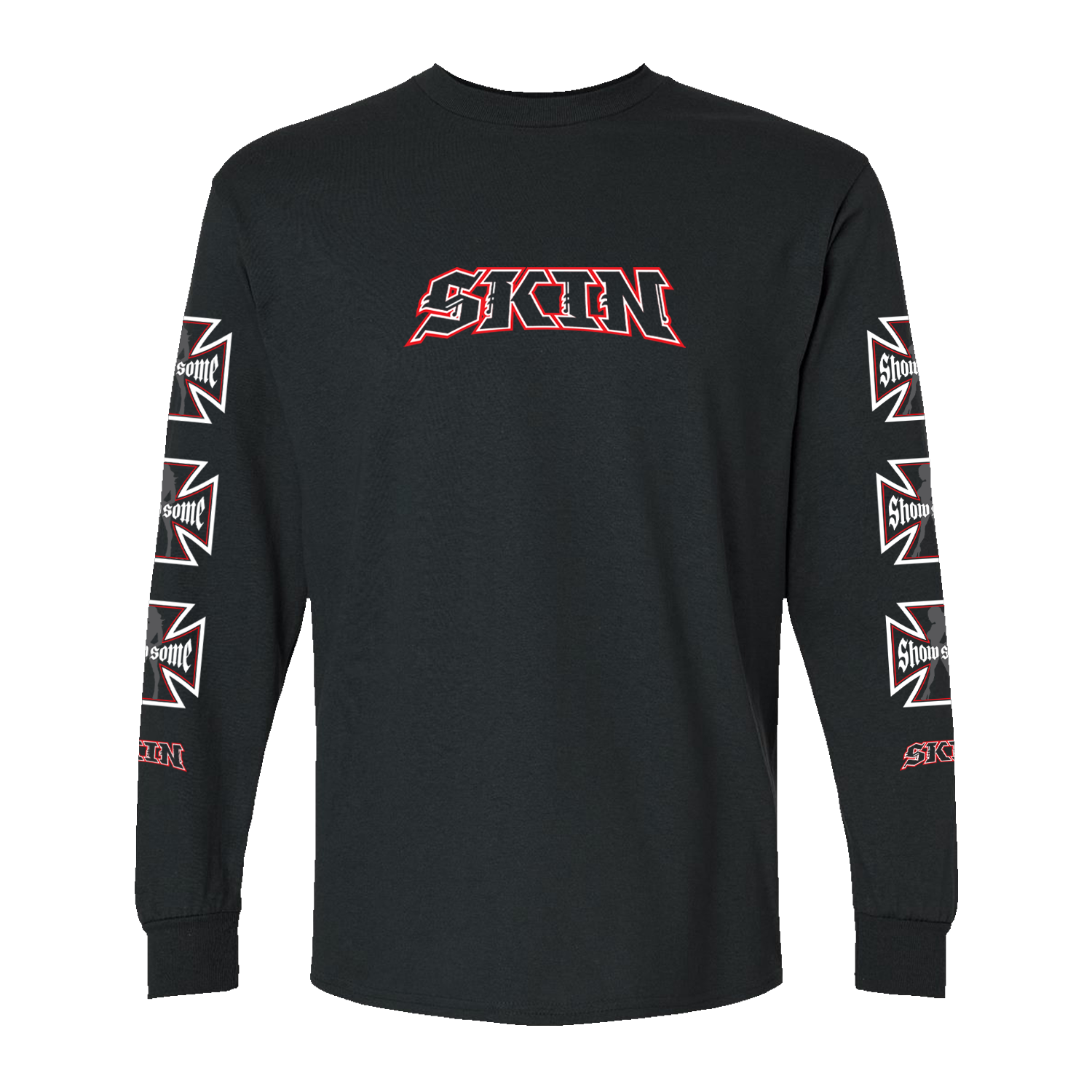 Large print on back with additional print on the front and also both sleeves. 4 Prints in all.
